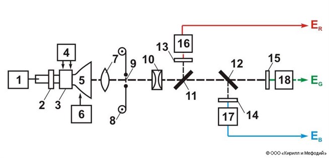 Схема камеры с бегущим лучом: 1 — усилитель импульсов для гашения обратного хода электронного луча кинескопа; 2 — фокусирующая система; 3 — отклоняющая система; 4 — генераторы строчной и кадровой разверток; 5 — проекционный кинескоп; 6 — источник постояннного высокого напряжения; 7 — объектив; 8 — устройство для продвижения киноленты; 9 — кадровое окно; 10 — конденсорная линза; 11, 12 — дихроические полупрозрачные зеркала; 13, 14, 15 — светофильтры; 16, 17, 18 — фотоэлектронные умножители. ER, EG и EB — видеосигналы соответственно красной, зеленой и синей составляющих цвета.
