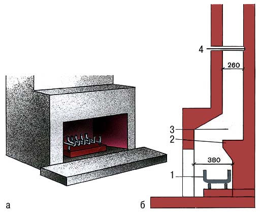 Внешний вид (а) и разрез (б) камина кирпичной кладки (размеры в мм): 1 — решетка (корзина) для топлива; 2 — газовый порог; 3 — дымоход; 4 — задвижка дымохода.