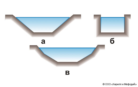 Формы поперечного сечения каналов: а — трапецеидальная; б — прямоугольная; в — полигональная.