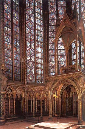 Сент-Шапель (Святая Капелла). 1243-1248 годы. Интерьер. Выдающееся достижение поздней французской готики — двухэтажная королевская капелла, выстроенная на острове Сите в Париже при короле Людовике IX Святом. В ее верхней церкви стены заменены 15-метровыми окнами, заполняющими простенки между тонкими опорами сводов.