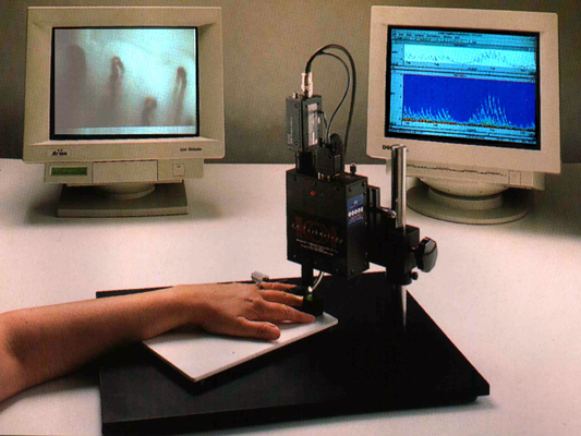 Изучение состояния капилляров края ногтевого ложа фаланги среднего пальца руки.