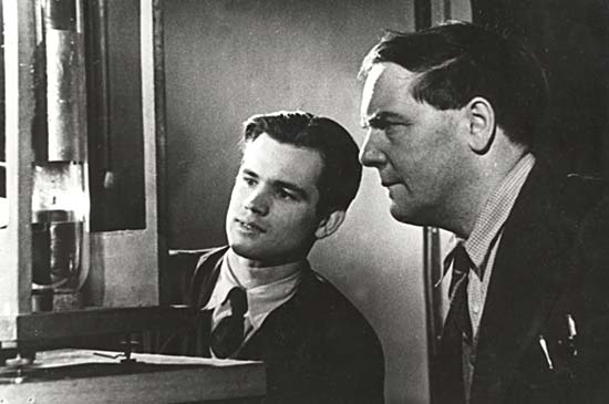 П. Л. Капица и его ассистент С. И. Филимонов во время лабораторного эксперимента по сверхтекучести гелия. 1939 год.