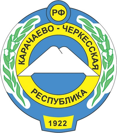 Герб Карачаево-Черкесской Республики был принят 3 февраля 1994 года. Он имеет круглую геральдическую форму. В центре композиции стилизированный силуэт Эльбруса, наложенный на синий круг. С боков — ветки и цветы рододендрона. Число 1922 означает год образования автономии Карачаево-Черкесии. Год вписан в форму, напоминающую чашу. Вверху, в малом круге, вписаны буквы РФ (Российская Федерация). Чаша и малый круг немного выходят за границы большого круга.