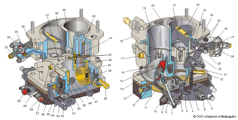 Карбюратор ВАЗа. 1. Рычаг привода дроссельных заслонок. 2. Ось дроссельной заслонки первичной камеры. 3. Возвратная пружина. 4. Тяга связи приводов воздушной и дроссельной заслонок. 5. Рычаг, ограничивающий открытие дроссельной заслонки вторичной камеры. 6. Рычаг связи с воздушной заслонкой. 7. Шток пневматического привода. 8. Рычаг управления дроссельной заслонкой вторичной камеры. 9. Рычаг, жестко закрепленный на оси дроссельной заслонки вторичной камеры. 10. Винт, ограничивающий закрытие дроссельной заслонки вторичной камеры. 11. Дроссельная заслонка вторичной камеры. 12. Отверстия переходной системы вторичной камеры. 13. Корпус дроссельных заслонок. 14. Корпус карбюратора. 15. Диафрагма пневматического привода дроссельной заслонки вторичной камеры. 16. Крышка пневматического привода. 17. Корпус топливного жиклера переходной системы. 18. Крышка карбюратора. 19. Малый диффузор вторичной камеры. 20. Колодец. 21. Малый диффузор первичной камеры. 22. Воздушная заслонка. 23. Рычаг воздушной заслонки. 24. Телескопическая тяга привода воздушной заслонки. 25. Тяга, соединяющая рычаг воздушной заслоним с рейкой. 26. Рейка пускового устройства. 27. Корпус пускового устройства. 28. Крышка пускового устройства. 29. Винт крепления троса привода воздушной заслонки. 30. Трехплечий рычаг. 31. Кронштейн возвратной пружины. 32. Патрубок для отсоса картерных газов. 33. Регулировочный винт пускового устройства. 34. Диафрагма пускового устройства. 35. Воздушный жиклер пускового устройства. 36. Канал связи пускового устройства с задроссельным пространством. 37. Воздушный жиклер системы холостого хода. 38. Распылитель ускорительного насоса. 39. Эмульсионный жиклер эконостата. 40. Воздушный жиклер эконостата. 41. Топливный жиклер эконостата. 42. Главные воздушные жиклеры. 43. Эмульсионная трубка. 44. Игольчатый клапан поплавковой камеры. 45. Топливный фильтр. 46. Патрубок. 47. Поплавок. 48. Главный топливный жиклер первичной камеры. 49. Регулировочный винт подачи топлива ускорительным насосом. 50. Перепускной жиклер ускорительного насоса. 51. Кулачок привода ускорительного насоса. 52. Возвратная пружина дроссельной заслонки первичной камеры. 53. Рычаг привода ускорительного насоса. 54. Регулировочный винт, ограничивающий закрытие дроссельной заслонки первичной камеры. 55. Диафрагма ускорительного насоса. 56. Колпачок пружины. 57. Корпус топливного жиклера системы холостого хода. 58. Регулировочный винт состава (качества) смеси холостого хода с ограничительной втулкой. 59. Патрубок, соединяемый с вакуумным регулятором распределителя зажигания. 60. Регулировочный винт количества смеси холостого хода.