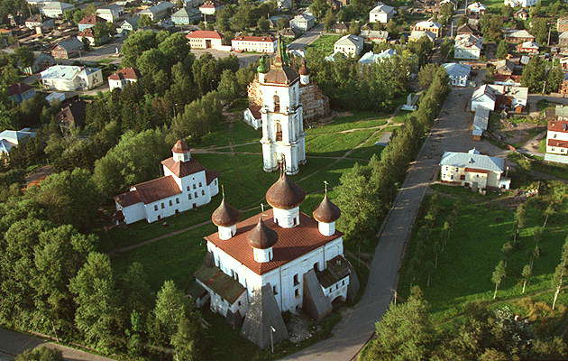 Церкви Каргополя. На переднем плане — кубическая 5-главая Благовещенская (1692), слева на заднем плане Никольская церковь (18 в.). На заднем плане справа — колокольня церкви Рождества Богородицы (пристроена в 19 в. к церкви 1680 г.).