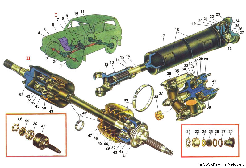 Карданная передача. 1. Привод левого колеса; 2. Передний мост; 3. Привод правого колеса; 4. Передний карданный вал; 5. Коробка передач; 6. Двигатель; 7. Эластичная муфта промежуточного карданного вала; 8. Шарнир равных угловых скоростей промежуточного вала; 9. Раздаточная коробка; 10. Задний карданный вал; 11. Задний мост; 12. Скользящая вилка; 13. Пресс-масленка; 14. Обойма сальника; 15. Сальник; 16. Наконечник карданного вала; 17. Труба карданного вала; 18. Балансировочная пластина; 19. Вилка карданного шарнира: 20. Крестовина карданного вала; 21 Стопорное кольцо игольчатого подшипника; 22. Корпус игольчатого подшипника; 23. Фланецвилка карданного шарнира; 24. Торцовая шайба; 25. Игольчатый подшипник; 26. Сальник игольчатого подшипника; 27. Сальник крестовины; 28. Корпус шарнира равных угловых скоростей; 29. Шарик; 30. Защитный чехол; 31. Защитный кожух чехла; 32. Сепаратор; 33. Болт крепления фланца эластичной муфты; 34. Фланец эластичной муфты; 35. 36. Балансировочная шайба; 36. Вкладыш эластичной муфты; 37. Резиновый элемент эластичной муфты; 38. Центрирующая втулка; 39. Хомуты; 40. Заглушка; 41. Грязеотражательное кольцо сальника; 42. Корпус наружного шарнира; 43. Стопорное кольцо; 44. Обойма наружного шарнира; 45. Упорное кольцо обоймы; 46. Защитный чехол наружного шарнира; 47. Защитный кожух чехла внутреннего шарнира; 48. Вал привода колеса; 49. Защитный чехол внутреннего шарнира; 50. Фиксатор; 51. Обойма внутреннего шарнира; 52. Корпус внутреннего шарнира; I. Схема трансмиссии; II. Привод передних колес.