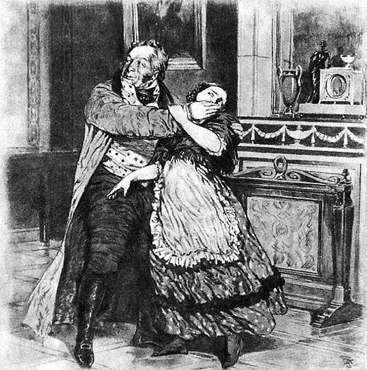 Лиза: Что встанет, доложусь, Извольте же идти, разбудите, боюсь. Фамусов: Чего будить? Сама часы заводишь, На весь квартал симфонию гремишь. Лиза (как можно громче): Да полноте-с! Фамусов (зажимает ей рот): Помилуй, как кричишь. С ума ты сходишь? (Иллюстрация Д. Н. Кардовского).