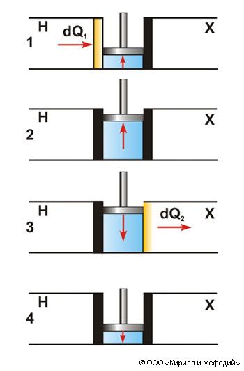 Схема работы идеальной тепловой машины, работающей по циклу Карно: 1. От нагревателя Н поступает теплота dQ1, газ под поршнем изотермически расширяется (по линии AB, см. схему цикла Карно). 2. Газ изолирован от нагревателя и холодильника и адиабатически расширяется (по линии BC). 3. Газ изотермически (при Т = Т2) сжимается (по линии CD) и отдает теплоту dQ2 холодильнику X. 4. Газ изолирован и адиабатически сжимается (по линии DA).