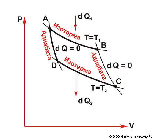 Цикл Карно на диаграмме р — V (давление — объем). dQ