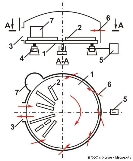 Схема карусельной печи: 1 — дисковый вращающийся под; 2 — нагреваемое изделие; 3 — окно загрузки и выдачи; 4 — опорный ролик; 5 — механизм вращения пода; 6 — горелка; 7 — дымопровод для отвода продуктов сгорания.