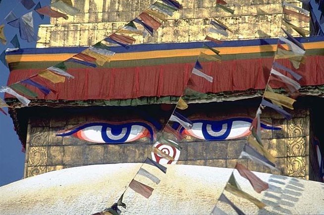 Всевидящие глаза Будды, изображенные на каждой из четырех сторон прямоугольного основания шпиля ступы Боднатх, бдительно взирают в направлении четырех сторон света. Катманду.