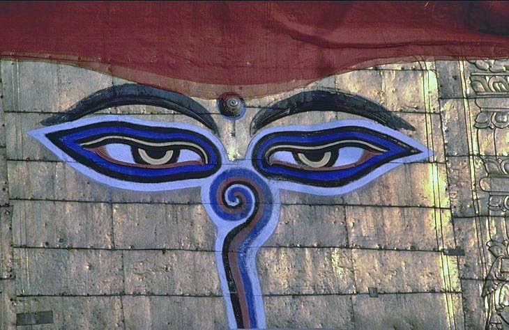 На четырех сторонах основания купола ступы Сваямбхунатх (3 в. до н. э., перестроена в 8-9 вв.) изображены всевидящие глаза Будды. Катманду.