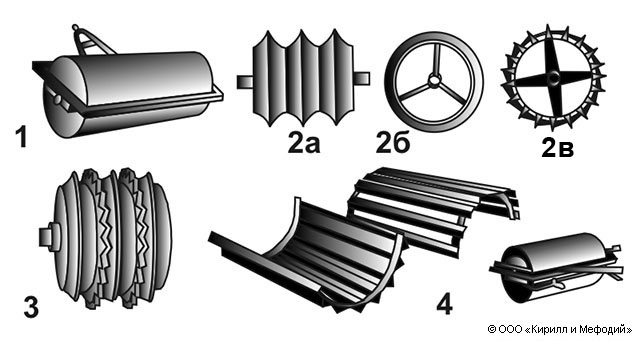Рабочие органы полевых катков: 1 — гладкий водоналивной цилиндр; 2а — кольцо с клинчатым ободом; 2б — кольцо с ребристым ободом; 2в — шпоровое кольцо; 3 — кольчато-зубчатый; 4 — гладкорубчатый цилиндр.