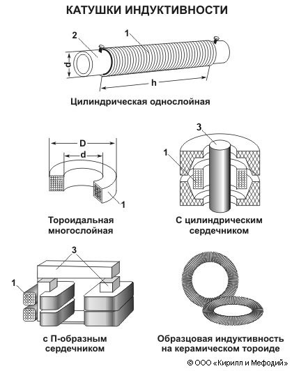 Катушки индуктивности: 1 — намотка (провод); 2 — каркас; 3 — сердечник; h — длина намотки; d — внутренний диаметр намотки; D — наружный диаметр намотки.