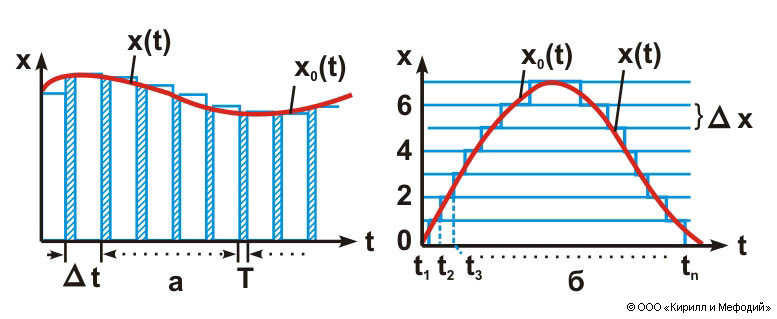 (t) — исходный сигнал; x(t) — квантованный сигнал; Δt — интервал квантования; Δх — уровень квантования.