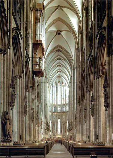 Кельн. Основной неф и алтарь Кельнского собора. Главным архитектурным сооружением и украшением городов позднего средневековья становится величественный готический собор. В его основе лежит упрощенная в плане романская базилика. Сущность готической конструкции состояла в каркасном перекрытии здания. Система аркбутанов и контрфорсов, вынесенная наружу, придавала собору особую ажурность, легкость и невесомость, снимая нагрузку со стен. Из-за большого количества оконных проемов, пространство готического собора стало более светлым.