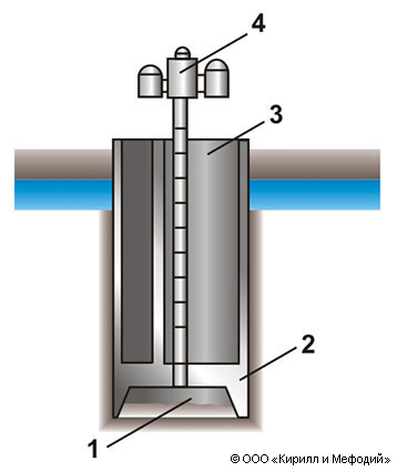 Кессон — опускное сооружение: 1 — рабочая камера; 2 — кессон; 3 — надкессонное строение; 4 — шлюзовой аппарат.