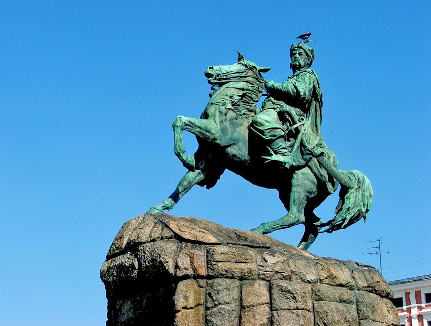 Киев. Памятник Богдану Хмельницкому на Софиевской площади. Правой рукой с гетманской булавой Богдан Хмельницкий указывает на север, в сторону Москвы. 1879-1888. Скульптор М. Микешин, архитектор В. Николаев.