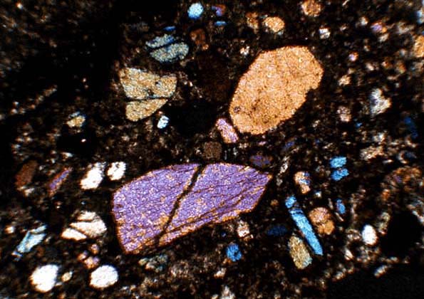 Кимберлит. Снимок под поляризационным микроскопом (увеличено в 40 раз) со скрещенными николями.