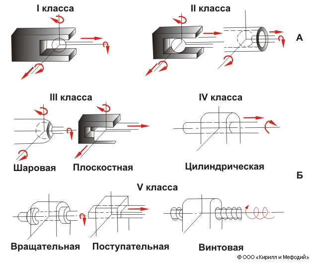 Кинематические пары: А — высшие, Б — низшие.