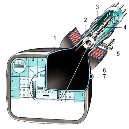 Схема конструкции черно-белого кинескопа: 1 — внутреннее проводящее покрытие (аквадаг); 2 — магнит центровки электронного луча; 3 — постоянный магнит ионной ловушки; 4 — электронный прожектор; 5 — отклоняющая система; 6 — электронный луч; 7 — высоковольтный вывод.
