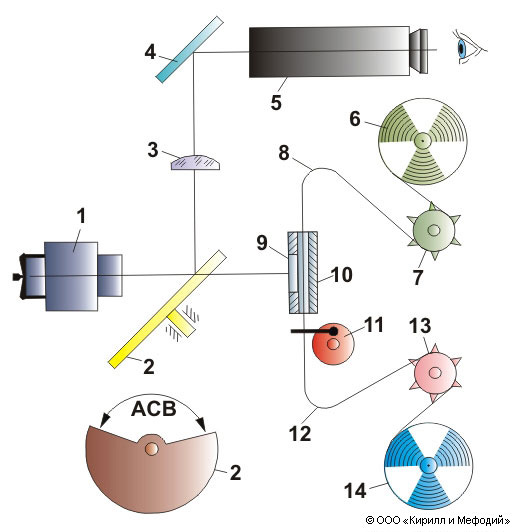 Принципиальная схема киносъемочного аппарата с зеркальным визиром: 1 — съемочный объектив; 2 — зеркальный обтюратор; 3 — коллективная линза; 4 — зеркало; 5 — визир-лупа; 6 — подающая кассета; 7 — тянущий зубчатый барабан; 8 — верхняя петля; 9 — кадровое окно; 10 — фильмовый канал; 11 — скачковый механизм; 12 — нижняя петля; 13 — задерживающий зубчатый барабан; 14 — принимающая кассета.