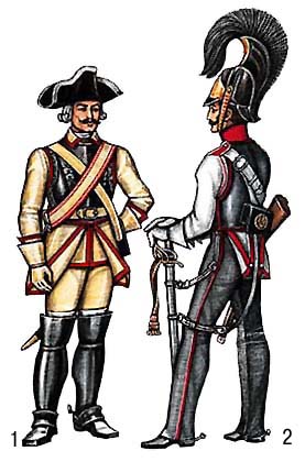 Кирасиры: 1 — рядовой Кирасирского полка, 1732-42 гг.; 2 — рядовой Псковского кирасирского полка, 1840-е гг.