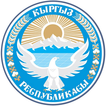 Герб Киргизии с 14 января 1994 года. На гербе изображены кречет Манаса, озеро Иссык-Куль, окруженное скалами Ала-Тоо. Вершины гор, похожи на белый киргизский колпак.