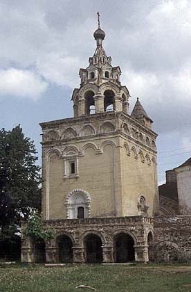 Киржач. Спасская церковь. 1656 год. Тогда же была построена галерея на арках, объединившая церковь с Благовещенским собором в единый ансамбль. Четверик Спасской церкви увенчан шатровой колокольней. Служила усыпальницей бояр Милославских. Самое древнее захоронение относится к 1600 году.