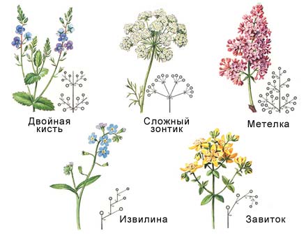 К сложным соцветиям относятся метелка, двойная кисть, извилина, завиток, а также сложные колос и зонтик.