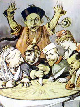 «Раздел Китая». Карикатура 1901 г. Слева направо: королева Виктория (Великобритания), кайзер Вильгельм II (Германия), Николай II (Россия), Марианна (символ Франции) и император Мицухито (Япония); на заднем плане — китайский император.