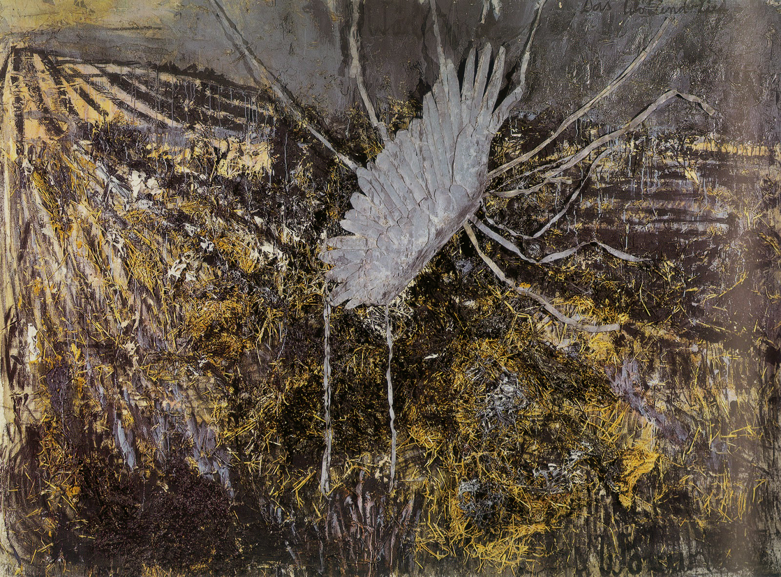 Ансельм Кифер. Песнь Велунда. 1982 год. Холст, масло, эмульсия, фотография. Частное собрание. Название картины отсылает к скандинавскому мифу о Велунде — искусном кузнеце, попавшем в плен к шведскому королю. Чтобы кузнец не сбежал, король изувечил ему ноги. В отместку Велунд убил королевских сыновей, изнасиловал королевскую дочь и сбежал, выковав себе крылья.