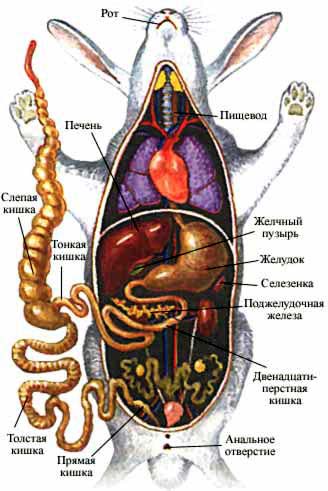 В полости тела кролика расположены органы пищеварения: глотка, пищевод, желудок, печень, желчный пузырь, поджелудочная железа и кишечник, а также сердце, легкие, парные почки и половые железы.