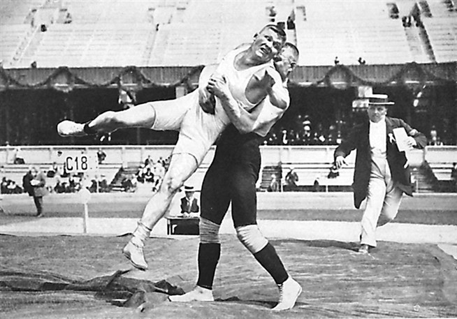 В полуфинале олимпийского турнира по борьбе встретились борцы российский М. Клейн (в черной форме) и финский А. Асикайнен. Поединок продолжался 11 часов. В итоге победил российский атлет.