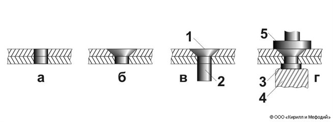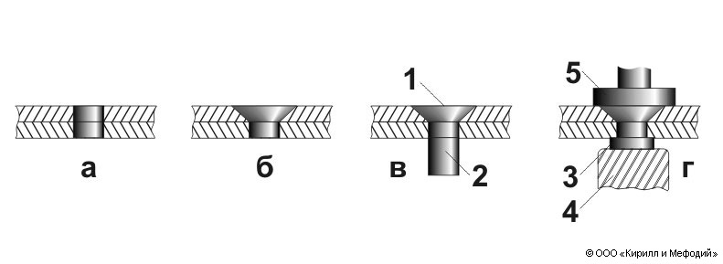 Основные операции клепки: а — образование отверстия; б — образование гнезда под потайную головку; в — вставка заклепки; г — образование замыкающей головки; 1 — закладная головка; 2 — стержень; 3 — замыкающая головка; 4 — обжимка; 5 — поддержка.