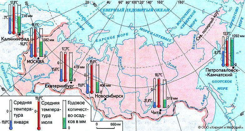 Изменение климата в зависимости от удаленности от океана. Географическая карта.