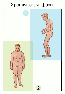 Клинические формы хронической фазы эпидемического энцефалита: 1) паркинсонизм; 2) нейроэндокринные нарушения.