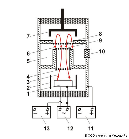 Схема конструкции отражательного клистрона: 1 — катод; 2 — фокусирующий цилиндр; 3 — электронный поток; 4 — ускоряющая сетка; 5 — объёмный резонатор; 6 — зазор объёмного резонатора; 7 — отражатель; 8 — вторая сетка резонатора; 9 — первая сетка резонатора; 10 — вакуумноплотное керамическое окно вывода энергии сверхвысоких частот из объёмного резонатора; 11 — источник напряжения резонатора клистрона; 12 — источник напряжения подогрева катода; 13 — источник напряжения отражателя.
