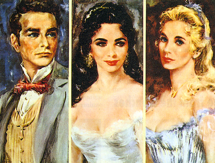 Плакат фильма «Округ Рейнтри» с участием Монтгомери Клифта, Элизабет Тейлор и Эвы-Марии Сент. Фильм был посвящен событиям гражданской войны, и именно во время его съемок Монтгомери Клифт попал в автокатастрофу, обезобразившую его лицо. 1957 год.