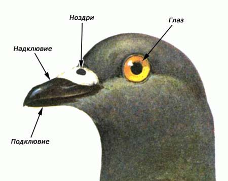 Голова голубя оканчивается тонким клювом. В основании надклювья открываются парные ноздри. По бокам головы расположены глаза, защищенные подвижными веками. Позади них лежат небольшие ушные отверстия.