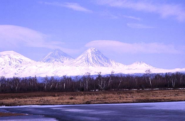 Вид на самую большую в Евразии группу вулканов (в том числе на вулкан Ключевская сопка) со стороны реки Камчатка.