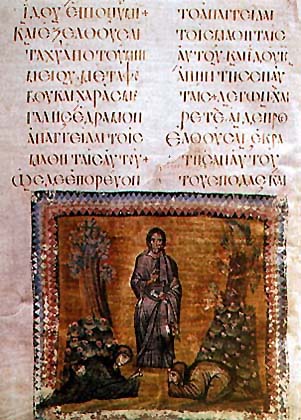 Страница греческой рукописной книги «Евангельские чтения» с миниатюрой «Христос является Мариям». 9 в.