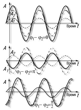 Сложение двух гармонических колебаний (пунктир) с амплитудами при различных разностях фаз (1, 2). Результирующее колебание — сплошная линия.