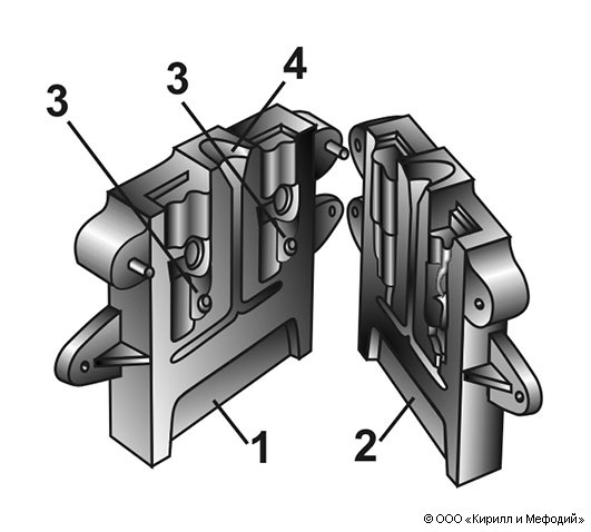 Кокиль с разъёмом в вертикальной плоскости: 1 и 2 — половины кокиля; 3 — гнёзда; 4 — литниковая система.