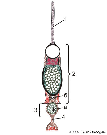 Одиночная колбочковая клетка черепахи: 1 — наружный сегмент; 2 — внутренний сегмент; 3 — ядросодержащая часть клетки; 4 — внутреннее волокно; а — ядро, б — миоид.