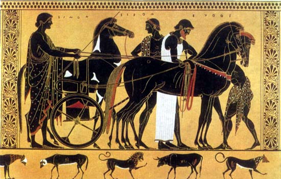 Подготовка к скачке на колеснице. Чернофигурная гидрия Финтия. Около 510 до н.э. Берлин.