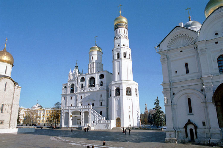 Колокольня Ивана Великого была возведена в 1505-1508 гг. итальянским архитектором Боном Фрязиным на Соборной площади Кремля на месте старого каменного храма 1329 г. В 1600 г. при Борисе Годунове она была надстроена и завершена куполом, ее высота достигла 81 метра. Колокольня служила главной дозорной башней Кремля, с высоты которой хорошо обозревалась местность в радиусе 30 километров.