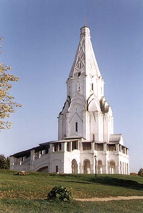 Церковь Вознесения в Коломенском (после реставрации). В 16 в. в каменной архитектуре Руси получил распространение шатровый храм с восьмигранным и остроконечным завершением, восходящий к традициям народного деревянного зодчества. Самым замечательным зданием подобного типа стала церковь Вознесения в бывшем селе Коломенском под Москвой. Особенностью Вознесенской церкви является стремительный переход от нижнего яруса-четверика к верхнему, изящному восьмерику. Удачно было выбрано место для строительства — храм будто вырастает из земли над крутым обрывом Москвы-реки.