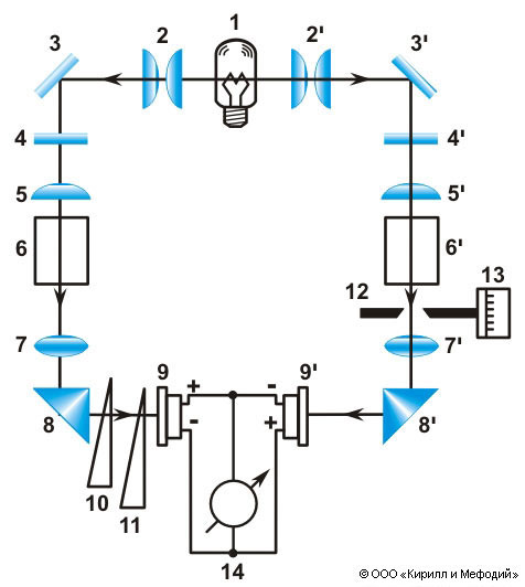 Принципиальная схема фотоэлектрического компенсационного колориметра типа ФЭК-М. Свет от источника 1 проходит в левом плече прибора (цифры без штрихов) через измеряемый раствор, в правом плече (цифры со штрихами) — через стандартный; разность сигналов селеновых фотоэлементов 9 и 9' регистрируется гальванометром 14. Неградуированные фотометрические клинья 10, 11 служат для установки гальванометра на нуль в отсутствие растворов. Оптическая компенсация, т. е. сведение разности сигналов приёмников 9 и 9' к нулю после установки кювет с растворами 6 и 6', осуществляется щелевой диафрагмой 12 с отсчётным барабаном (шкалой) 13, 2, 2' — конденсоры; 3, 3' — зеркала; 4, 4' — светофильтры; 5, 5' и 7, 7' — линзы; 8, 8' — призмы.