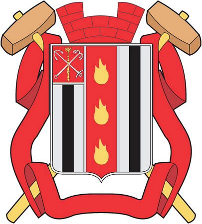 Герб города Колпино. В серебряном щите червленый столб, обремененный тремя золотыми пламенами и сопровождаемый двумя черными узкими столбами.